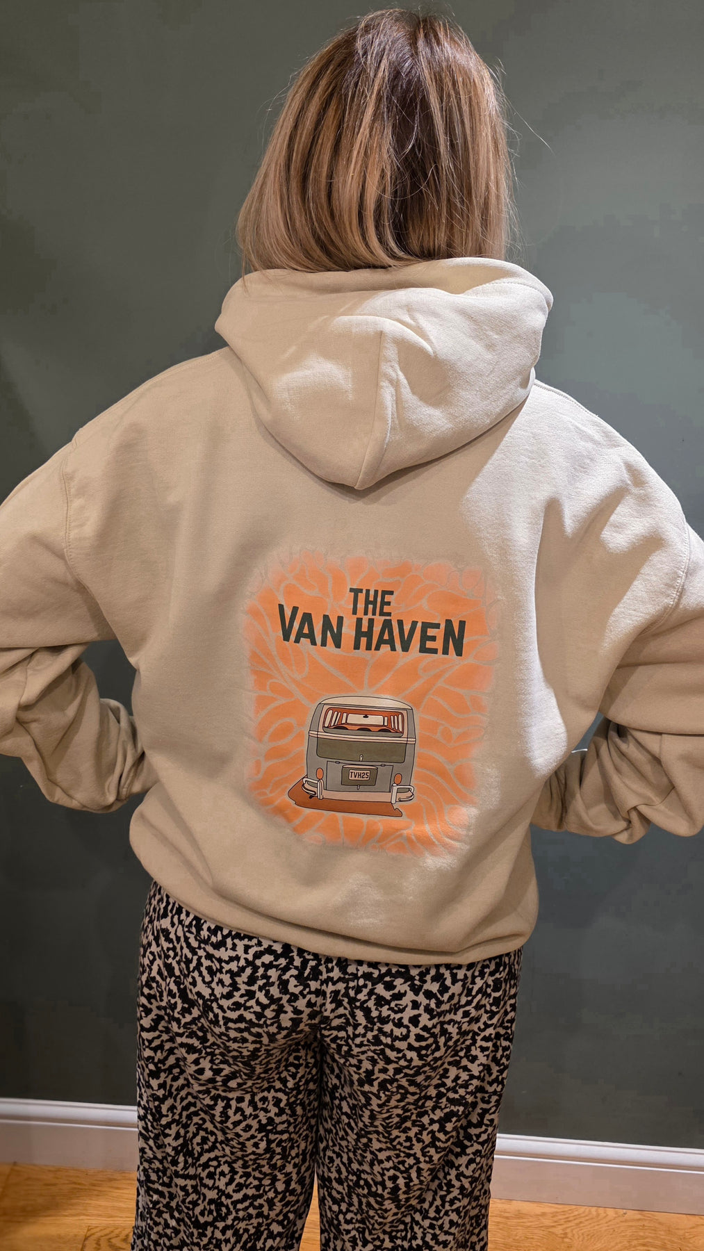 Featuring our signature hand-drawn campervan illustration on a soft cream backdrop, the design sits within a warm peach boho burst — giving it that dreamy, sun-soaked, retro vibe. The bold THE VAN HAVEN lettering completes the look, making this hoodie a statement piece for every adventure.